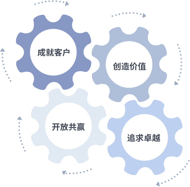 成就客户是一切决策的出发点,创造价值是衡量所有工作的标准,追求卓越是新币娱乐做事做人的态度,开放共赢是新币娱乐的格局也是最终的结果。价值观的齿轮环环相扣,推动着组织里的每个人不断向前。